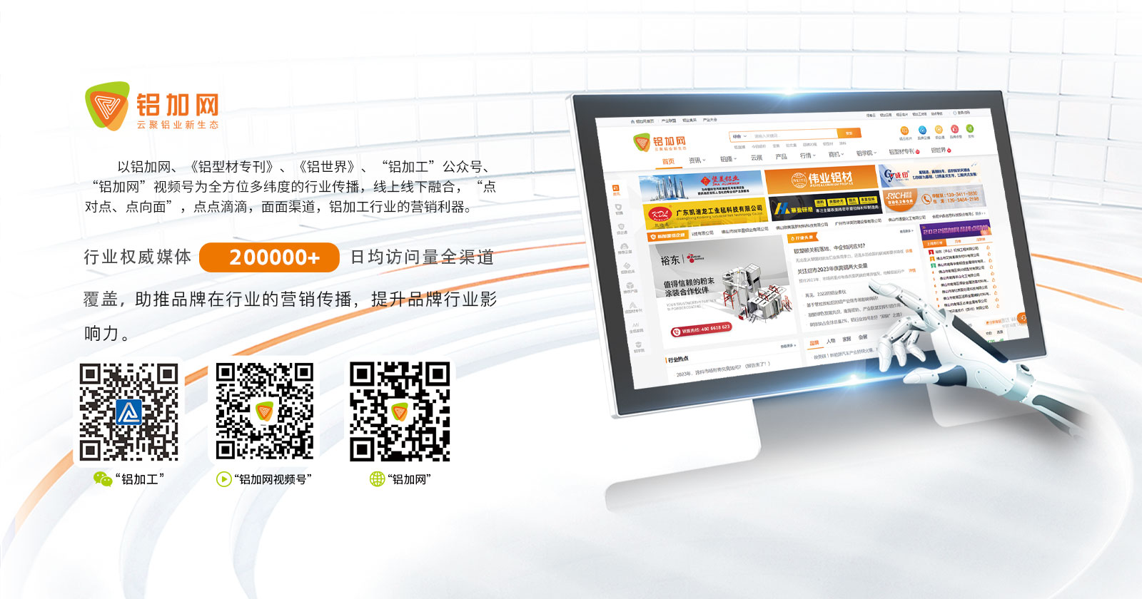 鋁加網(wǎng)(www.albiz.cn)是聞名鋁加工行業(yè)的垂直門戶網(wǎng)站,云聚鋁業(yè)新生態(tài),構(gòu)建鋁業(yè)新場景,以albiz.cn 網(wǎng)站為核心,以移動(dòng)云端、鋁加工微信、鋁加網(wǎng)視頻號、《鋁型材專刊》和《鋁世界》雜志為載體,成為了鋁加工行業(yè)資訊和精準(zhǔn)傳播的首選傳媒。鋁加網(wǎng),采集和發(fā)布全行業(yè)信息資訊,提供線上展覽、在線直播、短視頻、品牌策劃、品牌運(yùn)營、品牌傳播等全方位的專業(yè)服務(wù)。